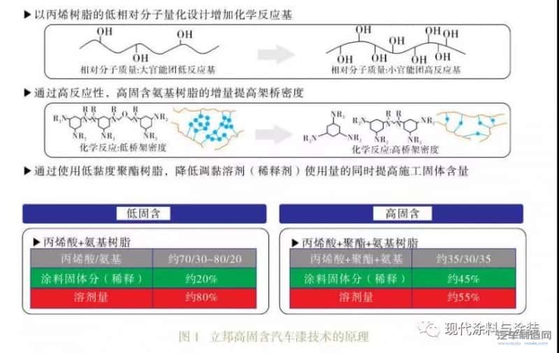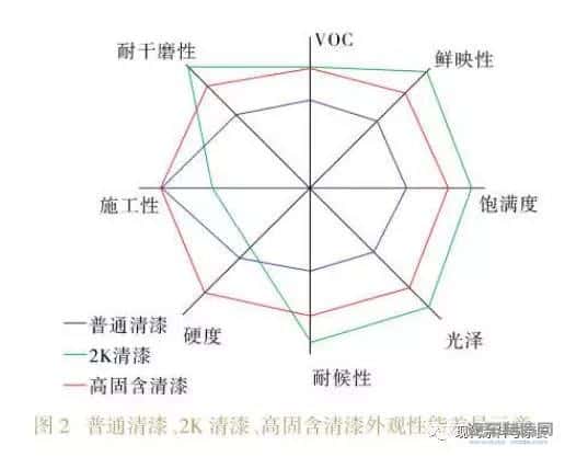 外观和性能的差异,除了与配套性和涂层厚度等有关外,主要差异取决于清漆。各家同类清漆产品的开发机理不尽相同,如立邦高固含采用低相对分子质量丙烯树脂+ 低黏度聚酯树脂+高固含氨基树脂(见图1),PPG高固含采用聚酯+丙烯酸体系,艾仕德高固含采用硅氧烷+丙烯酸体系,但总体来说,高固含清漆相比普通单组分清漆,VOC上有一定优势,施工性能相当或略好,在外观和性能上有所提升;2K清漆和高固含清漆VOC基本相当,在耐磨性、目视外观、耐溶剂等方面表现更好,参考部分涂料材料供应商和主机厂的资料绘制的3种产品大致差异示意见图2。