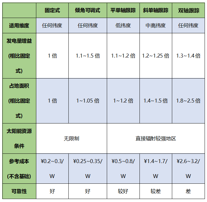 光伏支架成本虽然在整个光伏发电系统总成本中占比不大,只有百分之几,但选型确很重要,主要考虑因素之一就是耐候性。光伏支架在25年的寿命周期内必须保证结构牢固可靠,能承受环境侵蚀和风、雪载荷。还要考虑安装的安全可靠,能以最小的安装成本达到最优的使用效果。另外,后期是否能够免维护,有没有可靠的维修保证以及支架寿命周期结束以后是否可回收等都是需要考虑的重要因素。在设计和建设光伏电站时,选择固定式支架、倾角可调式支架还是自动跟踪式支架,需要因地制宜综合考虑,因为各种方式毕竟各有利弊,都在探索和完善之中,不同类型光伏支架特点如下图所示: